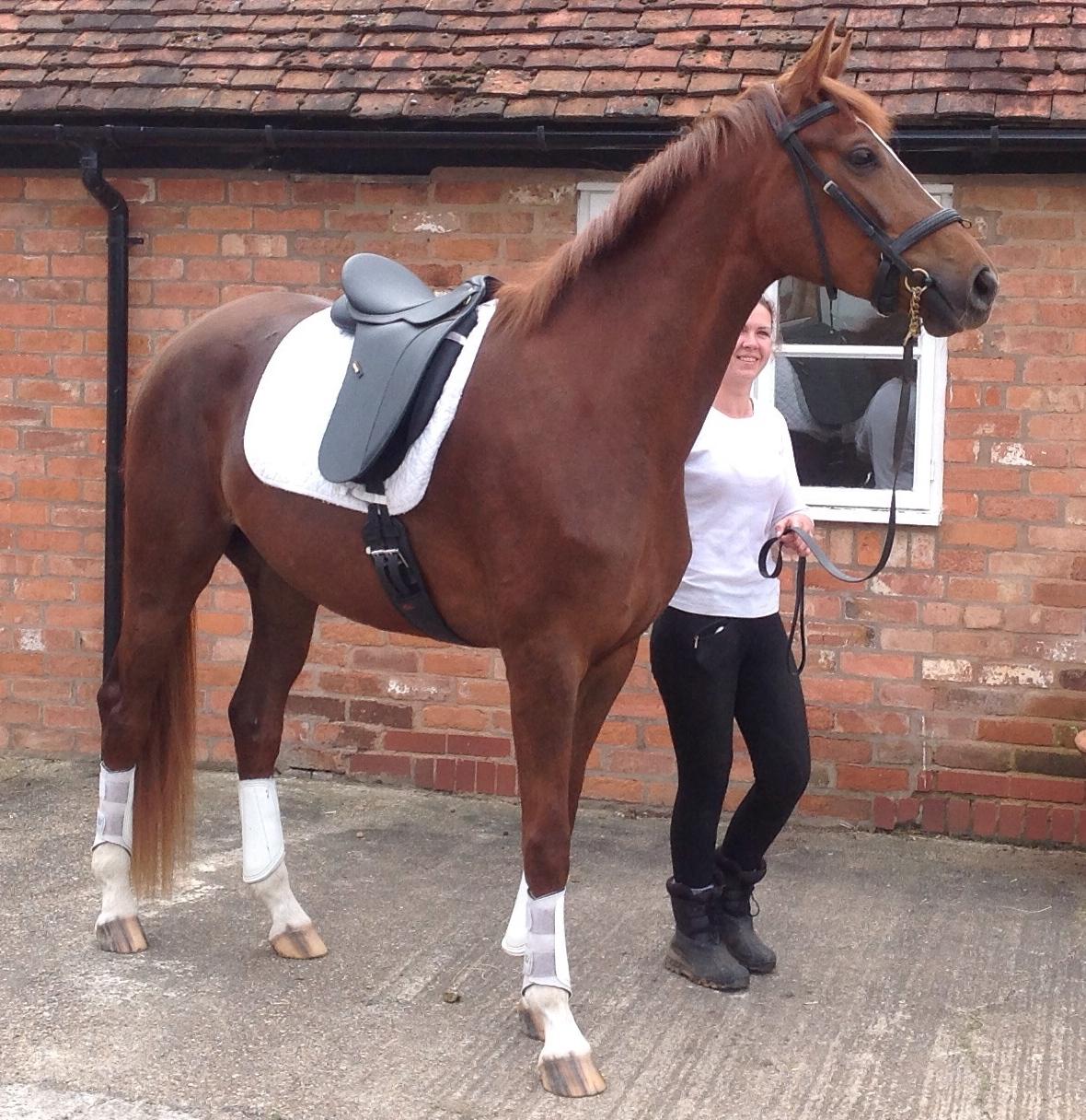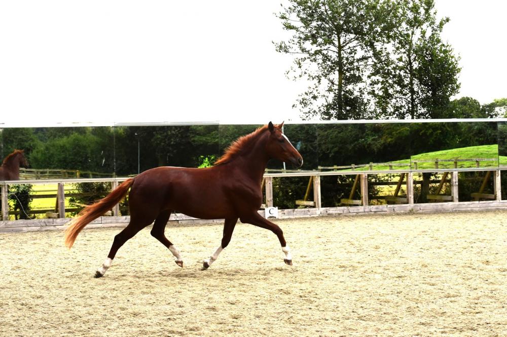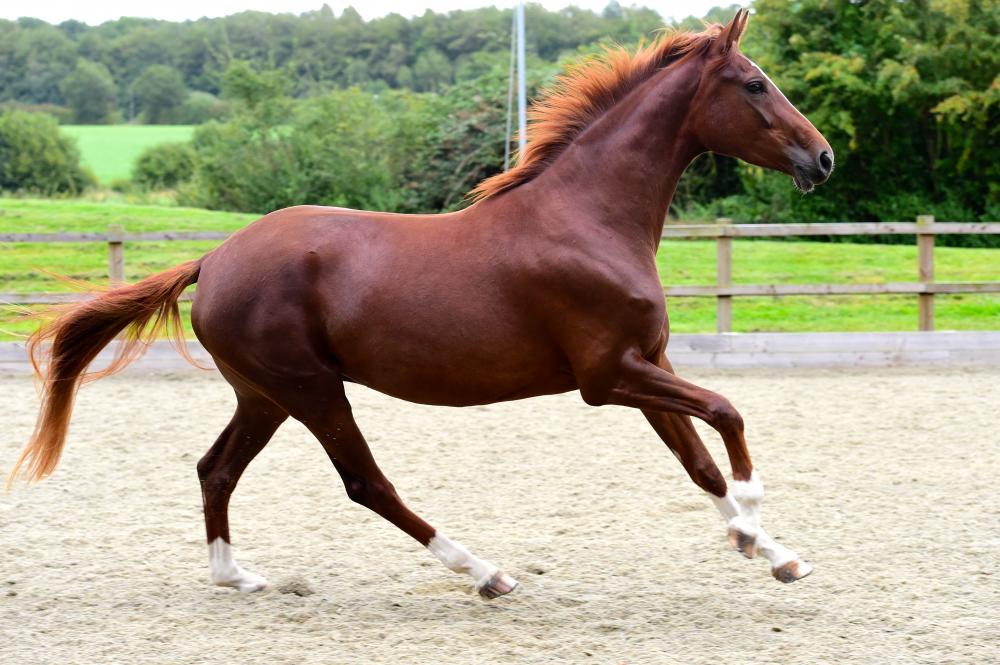 We bought Florisgold (or Fanta for short) as a foal in Germany in the late summer of 2011. She brings together the blood of the very talented stallion Floriscount (currently competing at small tour) with that of De Niro - the most prolific of dressage sires with more offspring competing at Grand Prix level than any other stallion except for Gribaldi. She is exceptionally beautiful with a rich deep chestnut colour, four white socks and an elegant tapering blaze on her fine head. She is an athletic youngster with a super topline and neck. She has an excellent canter and long swinging walk, while her trot is developing as she builds strength under saddle. She has been working on the long reigning and lunge during the latter half of 2014 and was backed in November. After time off over Christmas, she is now going well under saddle and will be aimed at young horse classes this spring. Fanta is from the coveted damline of the Champion Oldenburg mare Soiree D'Amour (who placed 5th in the World Breeding Championships in 2014).